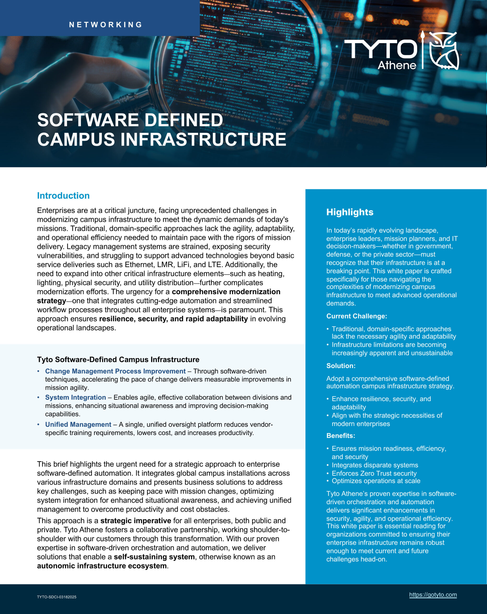 This white paper outlines how Tyto Athene transforms fragmented, legacy infrastructure into secure, agile, and efficient ecosystems through software-defined automation and Zero Trust architecture, enabling mission readiness, operational efficiency, and cost savings at scale. You will gain strategic insights into Tyto’s proven approach to modernizing campus infrastructure, with real-world results from deployments at Camp Pendleton and Camp Butler.